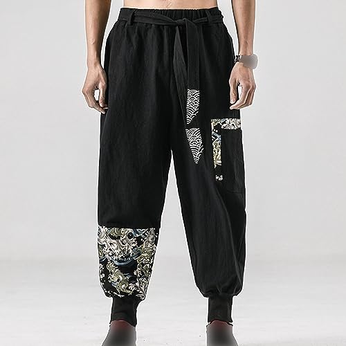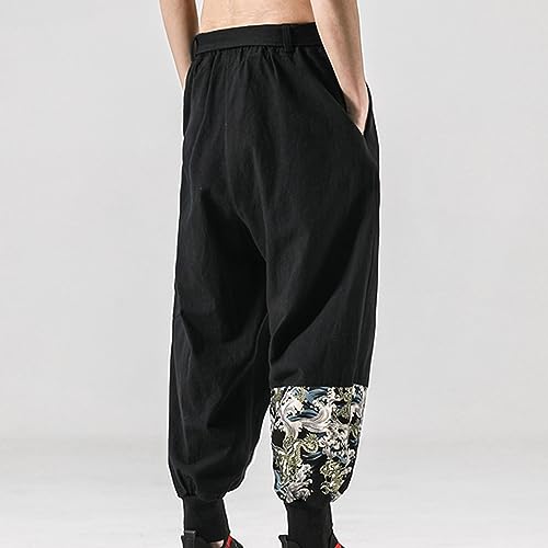 HOT ! Men's Vintage Embroidered Harem Pants Cotton Linen Elastic Waist Drawstring Trousers Chinese Style Casual Pants