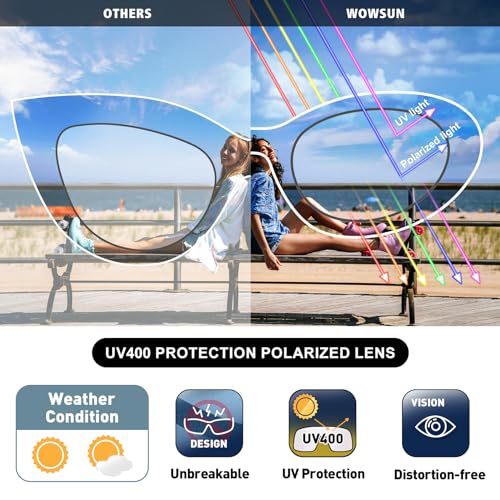 • Sun-Kissed Sophistication: Shield your eyes in style with our polarized sunglasses for women that combine fashion and function for the ultimate sun-kissed sophistication. Designed to reduce glare and enhance visual clarity, our polarized lenses offer superior UV 400 protection while ensuring you look effortlessly cool and collected wherever you go. Trendy cat-eye silhouettes are sure to turn heads and add a touch of timeless elegance to any outfit.