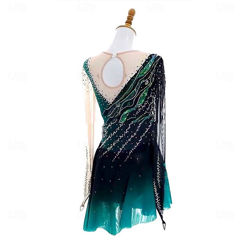 More information about Figure Skating Dress Women's Girls' Ice Skating Dress Dark Green Open Back Asymmetric Hem Mesh High Elasticity Training Competition Skating Wear Classic Crystal / Rhinestone Long Sleeve Ice Skating Figure