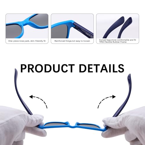 • TPEE Rubber Flexible Frame with Strap: The frames of these boys sunglasses age 3-8 are made of high-quality TPEE Rubber, which is soft and strong, bending freely and not easy to break. The hinge is made of high-strength metal material and has a long service life. The nose pad is a one-piece design that provides sufficient comfort for prolonged wear.In addition, these toddler sun glasses are equipped with a strap, which can be adjusted according to the needs, providing the safety of children.