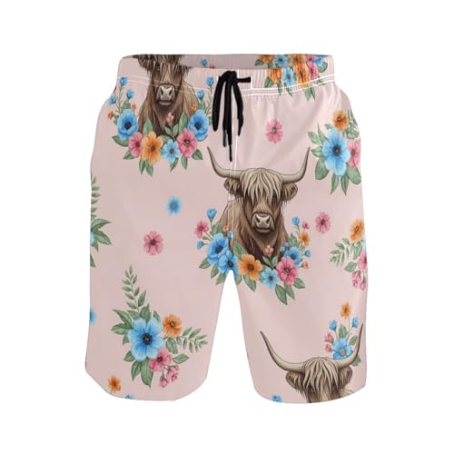 HOT ! Men's Swim Trunks Quick Dry Swimming Shorts with Pocket Highland Cows Blue Floral Swimsuit Trunks