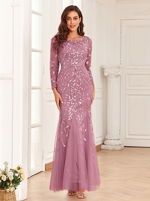 More information about Mermaid Evening Gown Sequin Elegant Dress Wedding Guest Prom Floor Length Long Sleeve Jewel Neck Tulle with Embroidery dress to impress