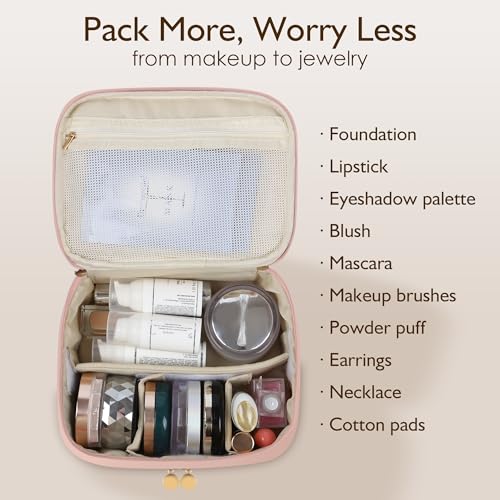 HOT ! Kendal Large Capacity Travel Makeup Organizer with Jewelry Storage, PU Leather Travel Toiletry Bag with Brush Holders, Zipper Pockets & Clear Divider, Travel-Friendly Vanity Case for Women, Pink