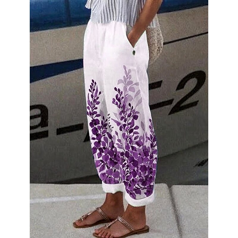 Women's Chinos Vacation Vintage Ethnic Style Ankle-Length High Waist Floral Graphic Leaf Pocket Soft Outdoor Breathable Inelastic Vacation Street Causal White-Blue Purple Green Khaki Summer Spring 2