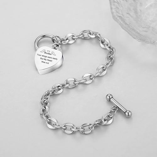 • Size – Ashes heart pendant size: 0.79" * 0.79". The bangle link chain size is: 7.87 inches (20cm), suitable for all age group people. It is very sturdy and comfortable for all day wearing, Beautifully inscribed with a touching saying”Brother,your wings were ready my heart was not”.