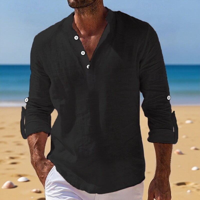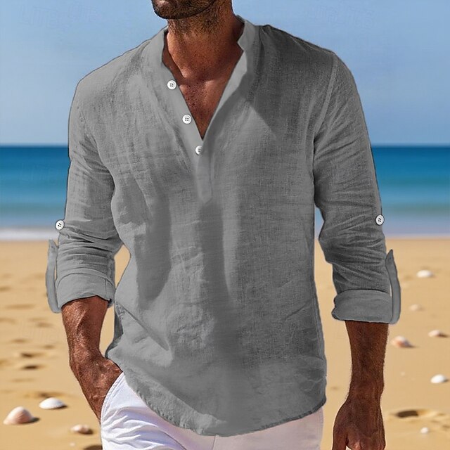 More information about Men's Linen Shirt Band Collar Shirt Popover Shirt Casual Shirt Beach Shirt Plain Vacation Holiday Black White Pink Orange Long Sleeve Henley Summer Spring & Summer Clothing Apparel