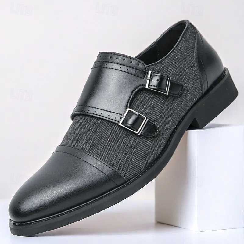 HOT ! Men's Double Monk Strap Shoes - Faux Leather and Herringbone Fabric, Classic Formal Dress Shoes for Business and Weddings