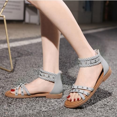 Womens Summer Rhinestone Embellished Flat Braided Shoes Studding Gladiator Sandals with Zipper Closure 5