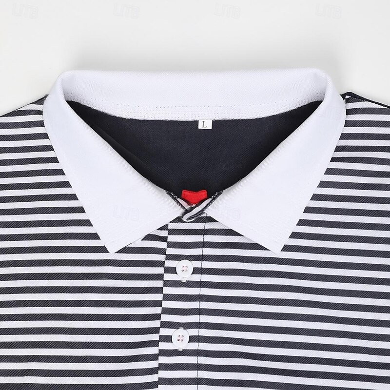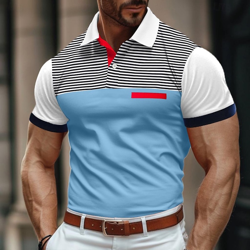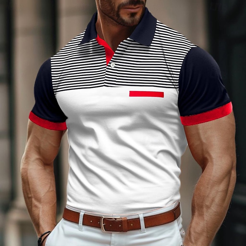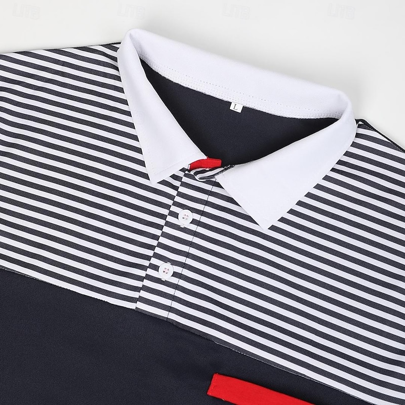 Highlights [Fabric] : Crafted from a high-quality cotton blend, this men's polo shirt offers breathability and softness for comfort throughout the day. The micro-elasticity of the fabric provides flexibility and ease of movement, making it suitable for various activities. [Fit] : Designed with a regular fit that caters to comfort without compromising style, this polo shirt accentuates the physique while allowing freedom of movement. It's perfect for those who prefer a well-fitted yet relaxed feel. [Design Highlights] : This shirt features a classic ribbed polo collar enhanced with a subtle pop of red under the white, adding a playful accent. The top part showcases a classic black and white stripe pattern, while the bottom contrasts with plain navy blue, highlighted by red accents for a modern twist. The short sleeves are trimmed with a dark navy finish, completing the sophisticated look. [Occasions] : Ideal for both casual and holiday settings, this polo shirt is versatile enough to wear for everyday outings or special occasions. It's perfect for pairing with jeans or casual trousers to create a smart, fashionable look. [Size Range] : Available in a broad size range from S to 3XL, this shirt provides an inclusive fit for a variety of body types. Choose your ideal size for a tailored look that suits any fashion-forward individual.