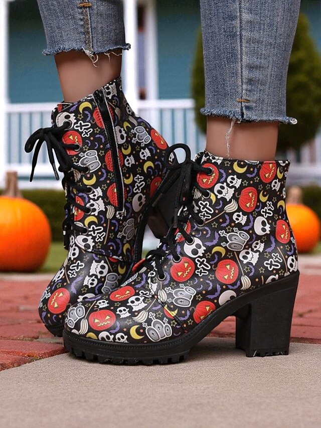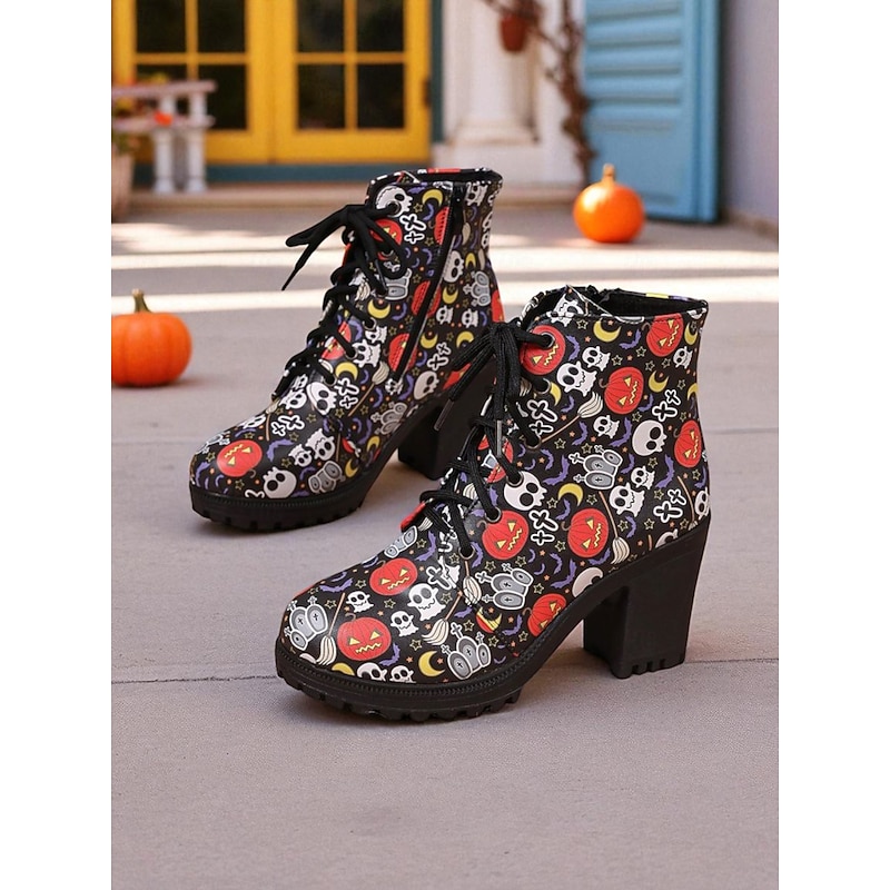 $26.99 - Women's Halloween Print Chunky Heel Lace-Up Ankle Boots – Spooky Skull & Pumpkin Pattern Gothic Style Combat Booties for Costume Parties & Fall Streetwear 2025. Shop for cheap Shoes For Women online? Buy at lightinthebox.com on sale today!