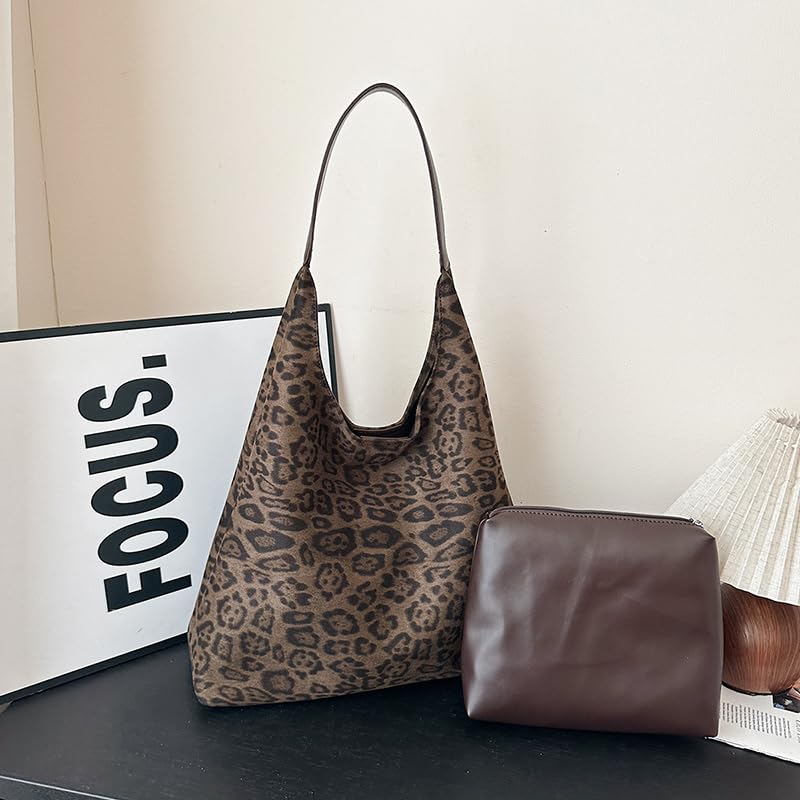 HOT ! Faux Suede Trendy Shoulder Bag Commute Tote Handbag with Purse (Leopard Khaki)