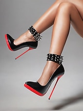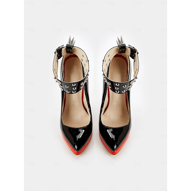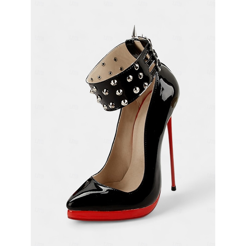 Highlights [Fabric] : Crafted from premium PU for a glossy, patent leather finish, these stilettos exude both elegance and durability. The synthetic leather lining ensures comfort, allowing for extended wear throughout any event. [Design and Shape] : The stiletto heels present a daring pointed toe, melding classic allure with audacious style. The towering cone heel adds instant height, enhancing the wearer’s posture and silhouette for a striking look. A black and red color palette underscores a timeless yet eye-catching contrast. [Design Highlights] : Accentuated with spiked and studded ankle straps, these heels incorporate punk-inspired elements into refined fashion. Each strap is secured with sturdy buckle closures, adding an edgy sophistication to the overall design. [Occasions] : Perfect for night outs, parties, or clubwear, these heels seamlessly blend sexy and fashion-forward style, making them an ideal choice for various social gatherings and festivities. [Size Notice] : Available in US sizes 6 to 10.5, these shoes follow standard sizing. We recommend selecting your usual size for the best fit.