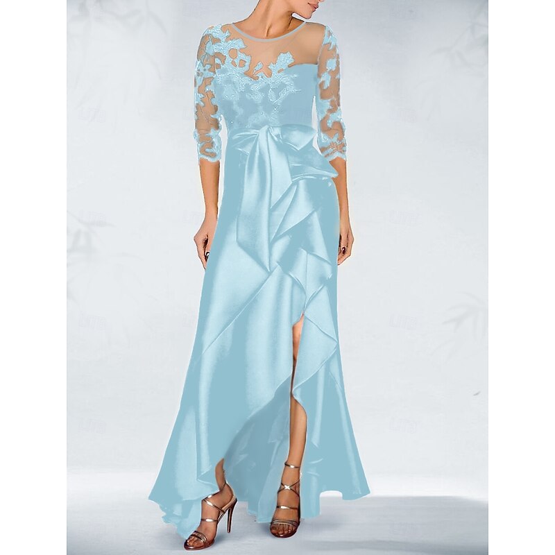 More information about A-Line Mother of the Bride Cocktail Dresses Black Dress Wedding Guest Fall Asymmetrical 3/4 Length Sleeve Jewel Neck Satin with Bow(s) Beading Appliques Dresses