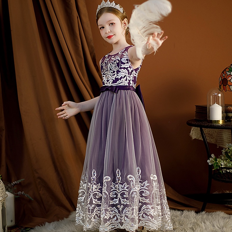 Kids Girls' Dress Flower Sleeveless Wedding Christening dress Princess Polyester Floral Embroidery Dress Flower Girl's Dress Summer 4-13 Years Deep Purple Watermelon Red Bean Paste 36