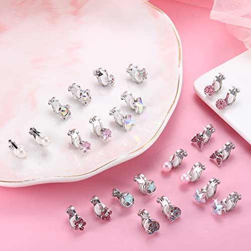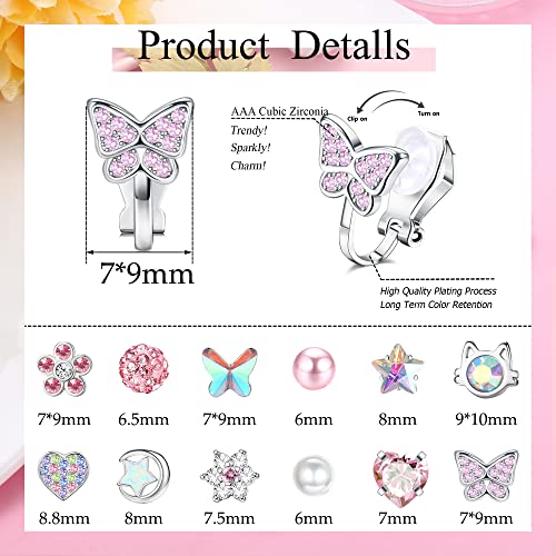 • CUTE CLIP ON EARRINGS: 12 Pairs clip on earrings for women with different styles. Bling and adorable design for your choice, Mixed with pearl earrings, heart earrings, butterfly earrings, flower earrings, star earrings, animals rainbow clip earrings, etc. These beautiful earring clips can easily match any clothes, whether it is a dress, or T shirt jeans.
