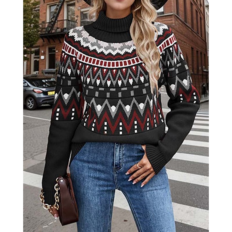 HOT ! Women's Faire Isle Sweater Turtleneck Knit Knitted Fall Winter Weekend Vintage Fashion Streetwear Long Sleeve Geometric Black White