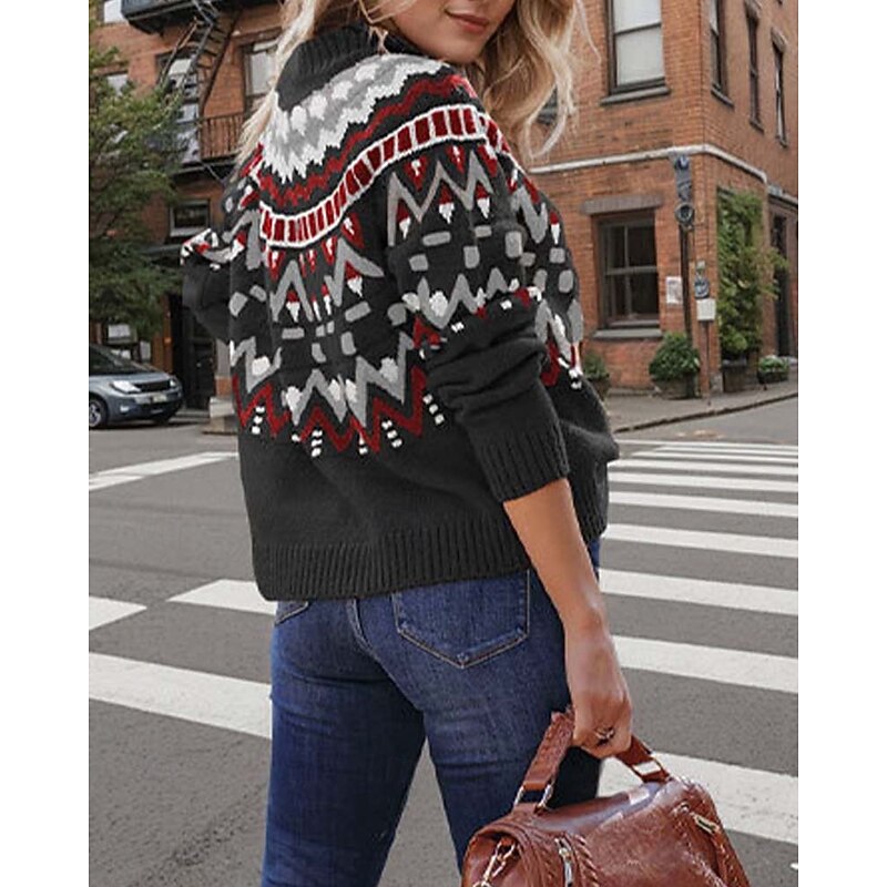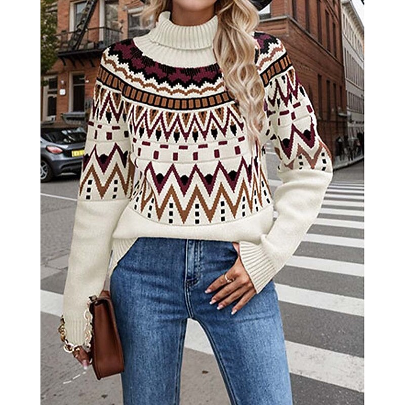 Highlights [Fabric] : Crafted from a soft and warm knitted fabric, this women's sweater is perfect for fall and winter. The material provides both comfort and insulation, making it ideal for cooler temperatures. [Fit] : With a regular fit and relaxed silhouette, this sweater offers ease of movement and can be effortlessly paired with jeans or skirts for a stylish, casual look. [Design Highlights] : Featuring a classic turtleneck, this sweater boasts an intricate geometric pattern that adds a vibrant and contemporary touch to your wardrobe. The long sleeves are finished with ribbed cuffs that ensure a snug, cozy fit. [Occasions] : Perfect for weekends, casual outings, and daily wear, this versatile sweater blends vintage and modern fashion for a chic streetwear appearance. Whether you're heading out for a relaxed weekend or a casual get-together, this sweater is a fantastic choice. [Size] : Available in sizes M, L, and XL, ensuring you can find the perfect fit for your style and comfort needs.