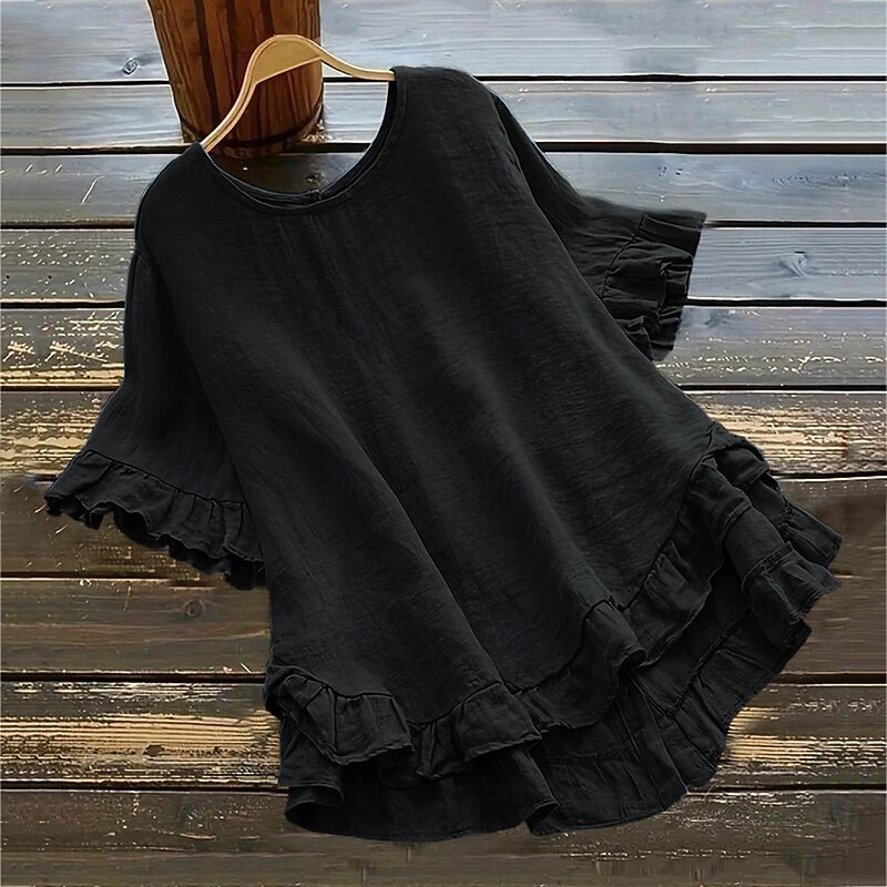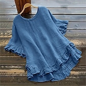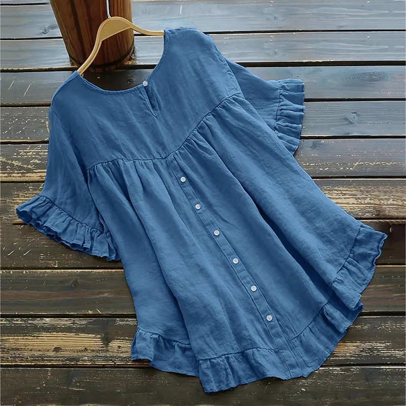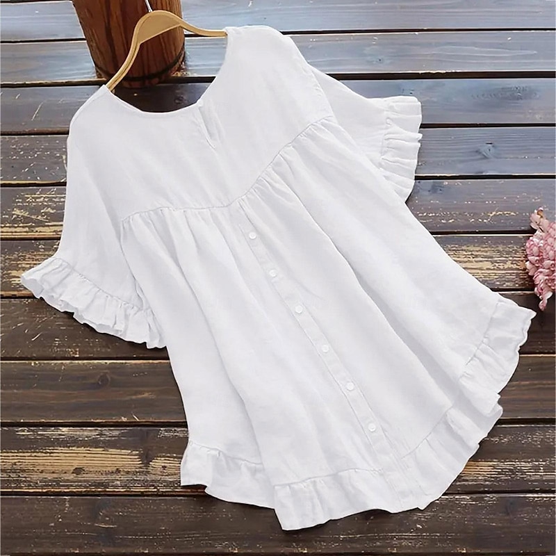 Highlights [Fabric]: Expertly crafted from a high-quality linen-cotton blend, this blouse offers a breathable and lightweight experience, ideal for warm summer days. Its inelastic fabric ensures a structured and timeless look while providing all-day comfort. [Fit]: The shirt features a regular fit that is both versatile and flattering, designed to enhance your silhouette without compromising on ease or style. It provides ample room for movement, making it perfect for everyday wear. [Design Highlights]: This fashion-forward blouse boasts a round neckline with a classic button-down front for easy wear. It includes short sleeves with delicate ruffle detailing that exudes femininity, while the hemline also incorporates ruffles to create a flowy and relaxed silhouette. [Occasions]: Ideal for street style and daily fashion, this blouse can be effortlessly paired with jeans or skirts for a casual yet chic ensemble. It's the perfect choice for bright summer days, offering a comfortable and stylish option for any everyday occasion. [Size]: Available in a wide range of sizes from S to XXL, ensuring a perfect fit for various body types and preferences, allowing you to enjoy tailored comfort and style.