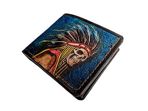 Indian Chief Skull, Native American Patriotic Card Holder, Apache, Headdress, Red Man, Men's 3D Genuine Leather Bifold Wallet, Carved wallet, Tooled wallet, Handmade Custom wallet, Personalized wallet 3