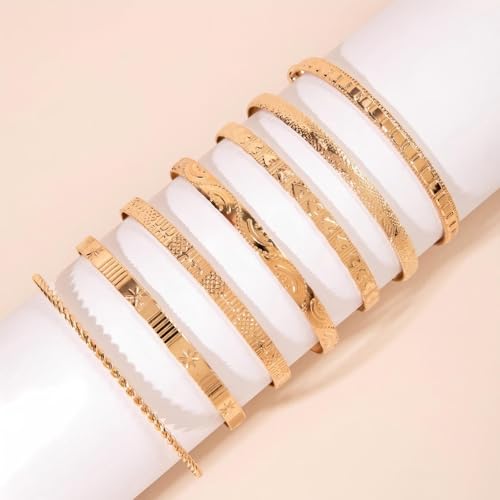 HOT ! Gold Bangle Bracelet, 7 Pcs Gold Plated Dainty Layered Chain, 14K Layer Stackable Cuff Bracelet Set for Women (Gold)