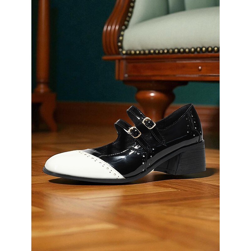 HOT ! Women's 1950s Vintage Mary Jane Oxford Heels – Two-Tone Patent Faux Leather Brogue Strap Shoes for Retro Swing Dance, Theater and Tea Party Outfits