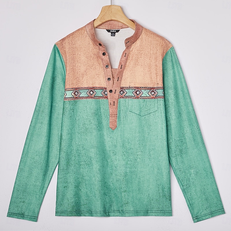 More information about Men's Geometric Ethnic Henley Shirt Tee Long Sleeve Ethnic Casual Summer Spring Fall Lake blue Dark Gray Black Green Light Blue Henley Henley T-Shirt