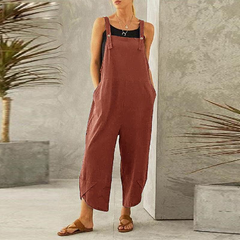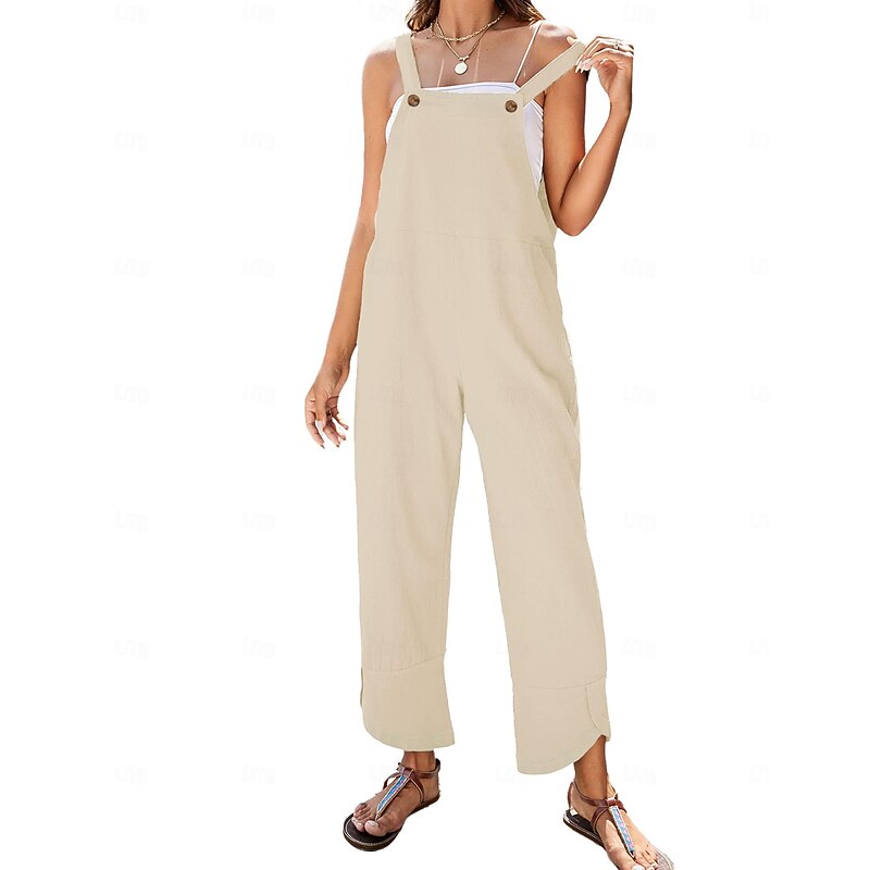 Highlights [Fabric] : Crafted from breathable linen fabric, this jumpsuit ensures comfort and ease in every setting. The lightweight material is perfect for maintaining a relaxed feel during both spring and fall seasons. [Fit] : The loose fit with straight, wide legs offers a laid-back yet stylish silhouette. Its inelastic nature provides a chic structure while remaining effortlessly comfortable for all-day wear. [Design Features] : Featuring a flattering square neckline and adjustable shoulder straps with metal buckles, this jumpsuit offers a versatile appeal. Functional side pockets add convenience, allowing for easy storage of small essentials. [Occasions] : Ideal for both dailywear and vacation, this jumpsuit suits a range of casual settings. Whether lounging at home or heading out for a casual day trip, it pairs easily with various tops and accessories for a stylish ensemble. [Sizes] : Available in a variety of colors including Black, Army Green, Red, and more, this jumpsuit comes in sizes S, M, L, XL, and XXL, catering to a wide size range for a perfect fit.