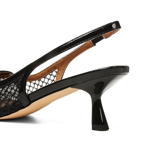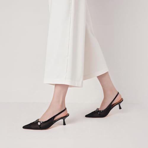 Kalstage Women’s Mesh Slingback Kitten Heels Pointed Toe Pumps Low Heel Black Lace Pearl Shoes Ankle Elastic Band Stilettos for Wedding Office Party 6