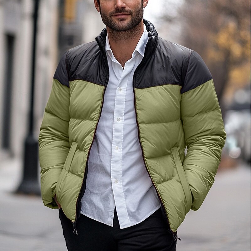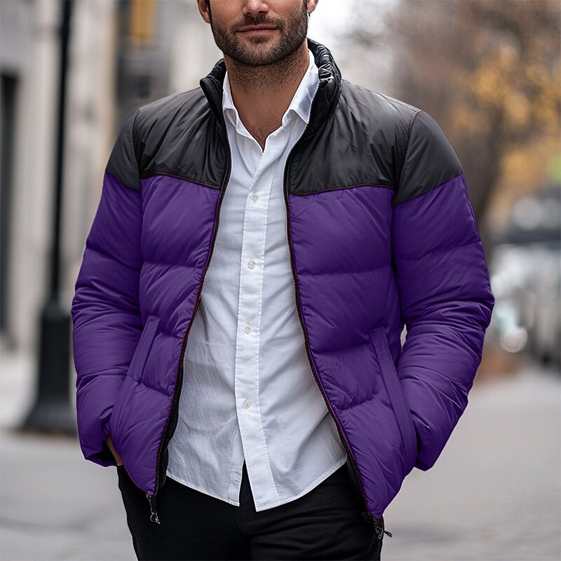 Men's Puffer Jacket Padded Pocket Color Block Party Christmas Outdoor Regular Neutral Fashion Daily Winter Solid Color Black White Purple Green Puffer Jacket 1