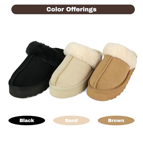 HOT ! Fuzzy Platform Slippers for Women, Cozy House Slippers Thick Sole Non-Slip, Faux Fur Vegan Suede Cushioned Foam Slide for Fireside Indoor/Outdoor (Brown/Sand/Black, US Women Size 6-9)