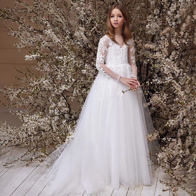 More information about Flower Girl Dress Girls' Formal Dress Princess Dress First Communion Dress Wedding Attire Wedding Party Princess Sweet Easter Ruched Solid Color Long Sleeve V Neck White 4 years+