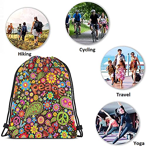 Peace Drawstring Bags Backpack Bag Sign Symbol Love Hippie Colorful Floral Butterfly Paisley Heart Leaf Sport Gym Sack Drawstring Bag String Bag Yoga Bag for Men Women 4