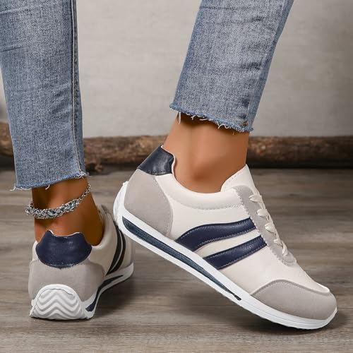 • Stylish Color-Block Design with Blue/Red Stripes & Beige Accents Combines a crisp white base with vibrant stripes and neutral accents for a trendy, sporty look that pairs effortlessly with jeans, leggings, or athletic wear.