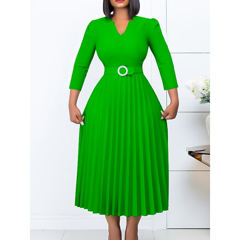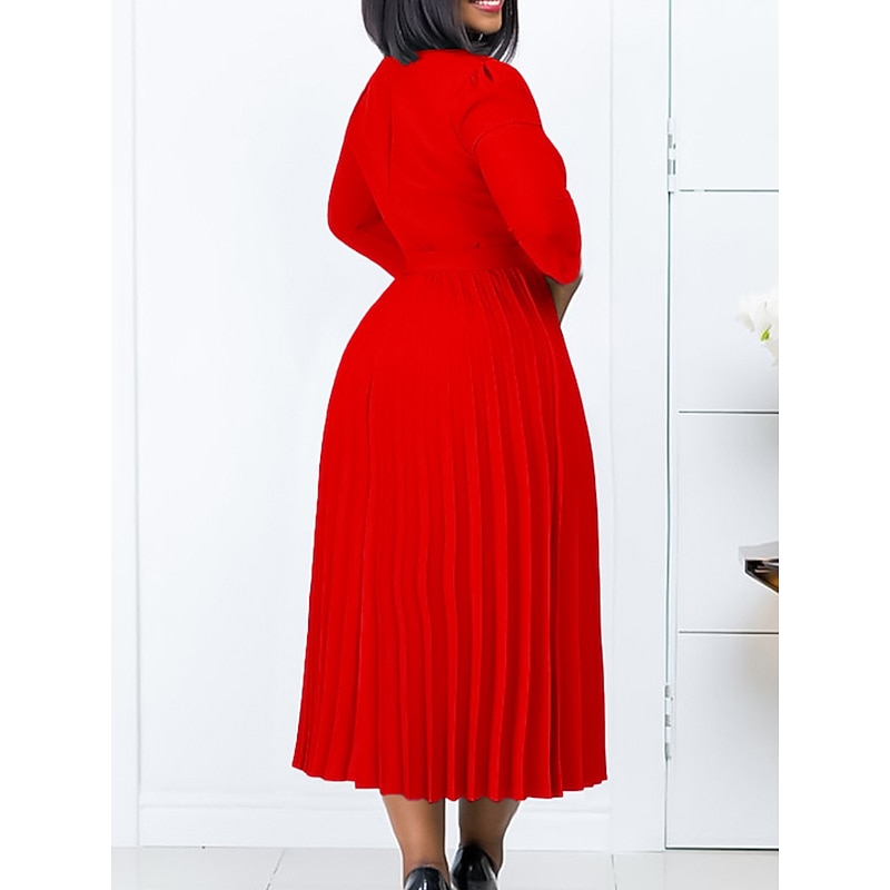 Highlights [Fabric] : Crafted from a high-quality polyester and lace blend, this dress offers durability alongside a smooth, polished finish. The micro-elastic nature of the fabric ensures a comfortable fit, making it suitable for all-day wear. [Silhouette] : Featuring a classic A-line cut, this midi dress offers a regular fit that highlights the waist elegantly. The addition of ruched and patchwork details further enhances its sophisticated appearance. [Design Highlights] : The dress boasts a flattering V-neckline and structured long sleeves that add to its chic charm. It includes a stylish belt for waist accentuation and a beautifully pleated skirt that flows gracefully. The plain pattern design keeps the dress versatile and sophisticated. [Occasions] : This versatile dress is ideal for daily wear, office settings, or a chic evening out. Its modern and elegant style makes it suitable for various occasions, from business meetings to casual gatherings. [Size Range] : Available in a wide range of sizes, including S, M, L, XL, XXL, and 3XL, ensuring a perfect fit for women of different body types. The color options include Blue, Green, Red, and Yellow, offering a choice for every personal style preference.