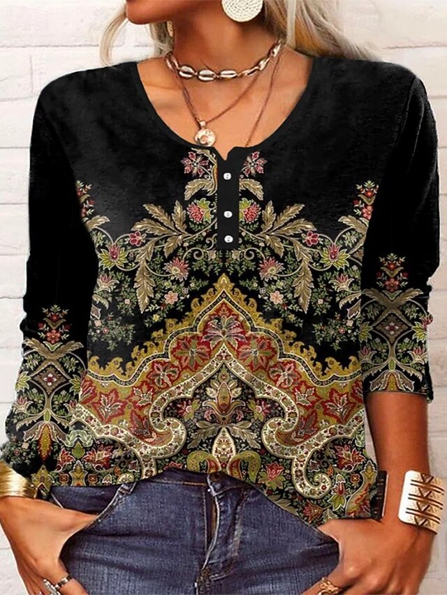 Highlights [Fabric] Crafted from high-quality polyester, this blouse offers a soft and breathable feel, perfect for comfortable all-day wear during the spring and fall seasons. The micro-elasticity of the fabric ensures a flexible fit, adapting to your movements with ease. [Fit] This women's top features a regular fit with a casual, relaxed style that drapes beautifully on the body. The long sleeves complement the overall design, adding a touch of sophistication to the look. [Design Highlights] Featuring a vibrant floral print with ornate patterns in shades of gold, red, and green, this top offers a striking visual contrast against the black background. It includes a round neckline and button details, contributing to its fashionable appeal. [Occasions] Whether for daily wear or weekend gatherings, this top is an excellent choice for a variety of settings. Its versatility allows it to be paired with both jeans and skirts, creating a chic, bohemian style that is suitable for casual outings or social celebrations. [Size Range] Available in a wide range of sizes, including S, M, L, XL, 2XL, and 3XL, ensuring a comfortable fit for different body types.