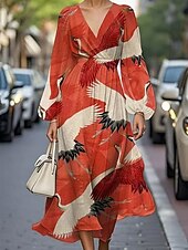 More information about Women's Midi Dress Casual Dress Print Dress Elegant Fashion Outdoor Party Holiday Regular Fit Flower Long Sleeve V Neck Black Orange Light Blue Summer Spring