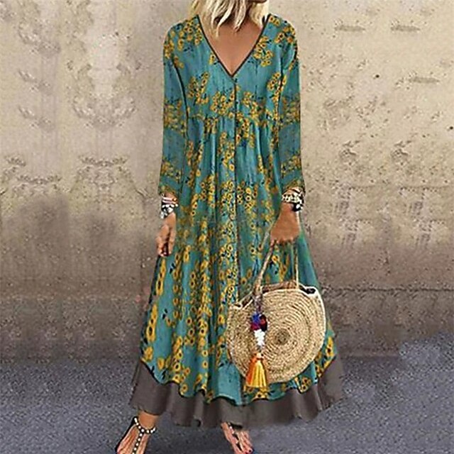 HOT ! Women's Long Dress Maxi Dress Print Dress Fashion Classic Modern Outdoor Vacation Holiday Regular Fit Graphic Flower Long Sleeve V Neck Yellow Wine Blue Green Spring