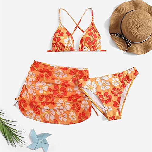 Kids Child Girls 3 Piece Swimsuits Bathing Suit Flower Print Bikini Tops Underpants Ruffles Skirt (Red, 8-10 Years) 3
