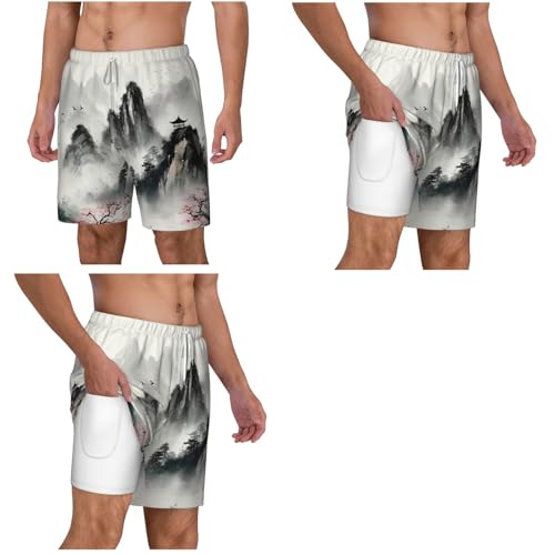 Men's Swim Trunks speedy Dry Board Shorts Ink Painting Style Mountain Beach Shorts with Pocket Bathing Suits for Men
