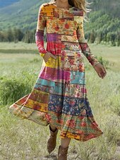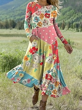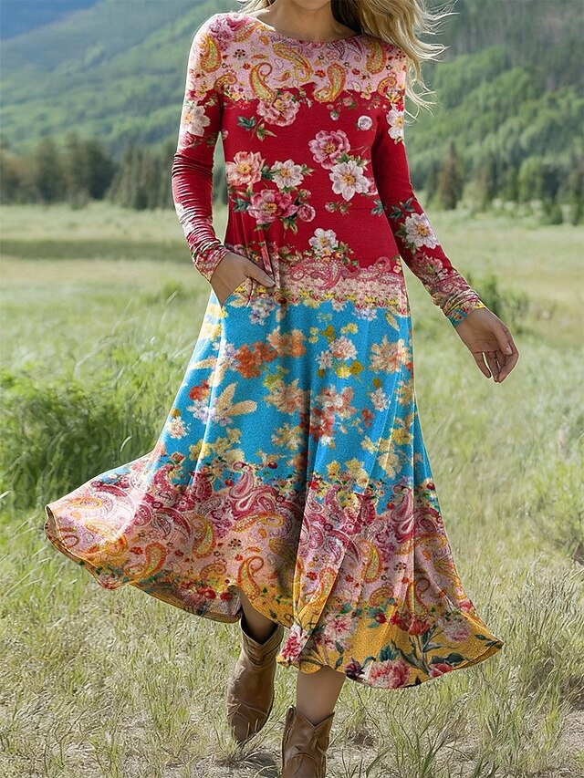 More information about Women's Midi Dress A Line Dress Fit And Flare Dress Vacation Casual Daily Regular Fit Floral Graphic Long Sleeve Crew Neck Pink Red Orange Rainbow Spring Fall Winter