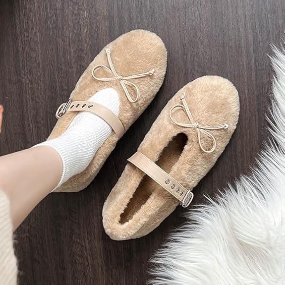 HOT ! Fur Ballet Flats with Buckle for Women Comfy Faux Shearling Mary Jane Flats Comfy Cute Faux Fur Flat Shoes for Women