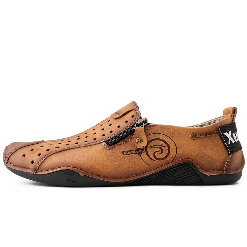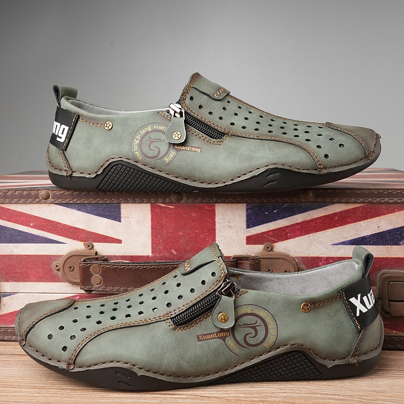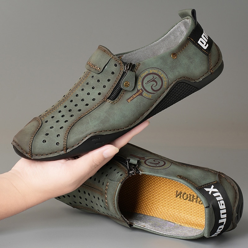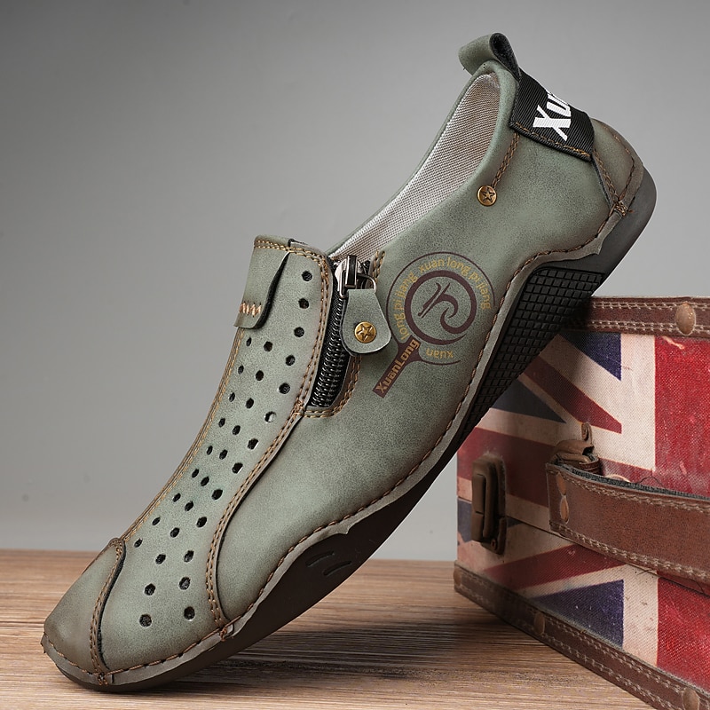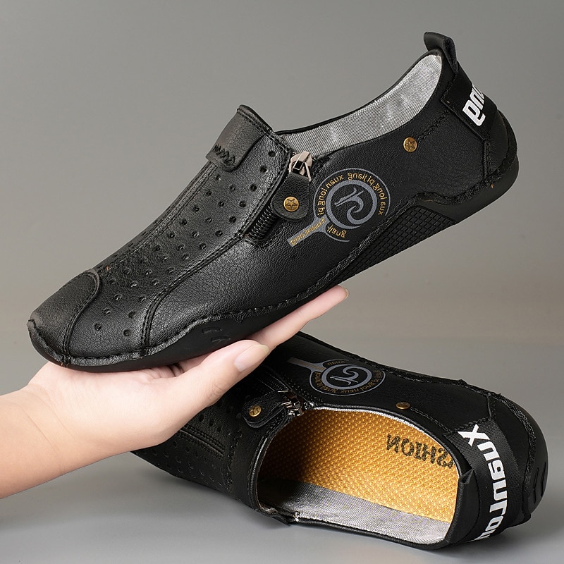 HOT ! Men's Breathable Faux Leather Slip-On Casual Shoes – Vintage Style Loafers with Zipper & Perforated Design for Driving, Walking & Daily Wear