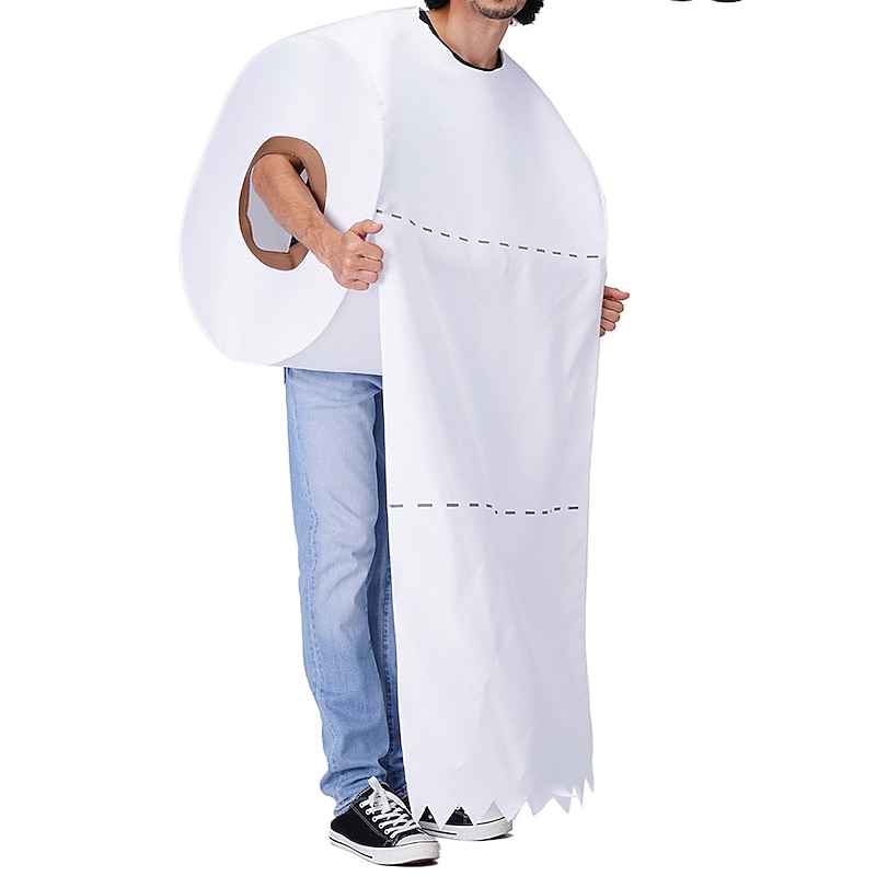 : Designed in a loose-fitting, pullover style, this costume allows for easy dressing and removal. It is created to fit most adults comfortably, providing ample room for movement and layering over other clothing. The ensemble includes a leotard/onesie featuring a creative "giant toilet paper roll" concept, with details that mimic the classic cardboard core and perforated lines.