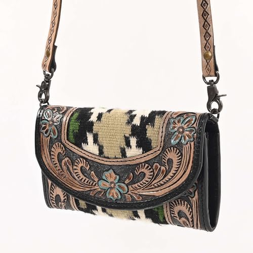 HOT ! Western Crossbody Purse for Women – Tooled Leather Flap Shoulder Bag with Floral Design & Woven Aztec Pattern – Small Handmade Boho Satchel with Adjustable Strap