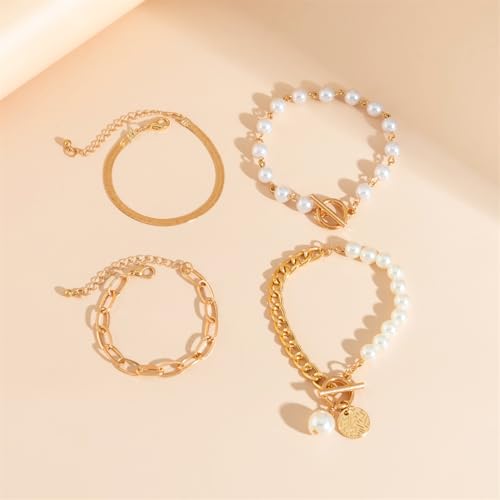 4Pcs Gold Tennis Link Bracelets Set for Women,14K Gold Plated Pearl Bracelets for Women,Dainty Layered CZ Paperclip Snake Cuban Link Chain Bracelets for Women