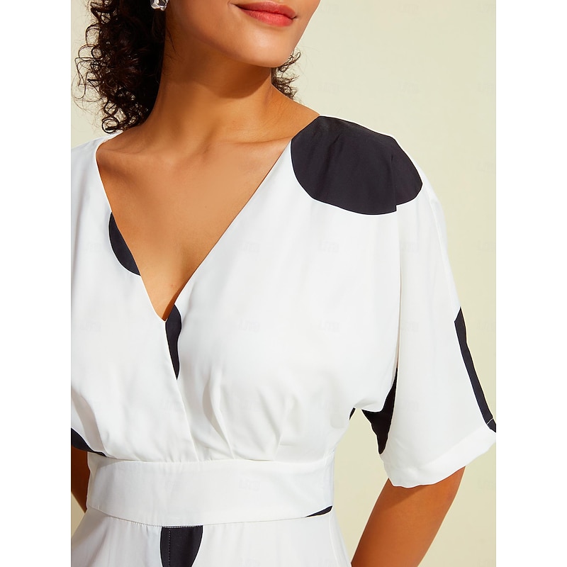 HOT ! Satin Hem Polka Dot Waistband V Neck Maxi Dress