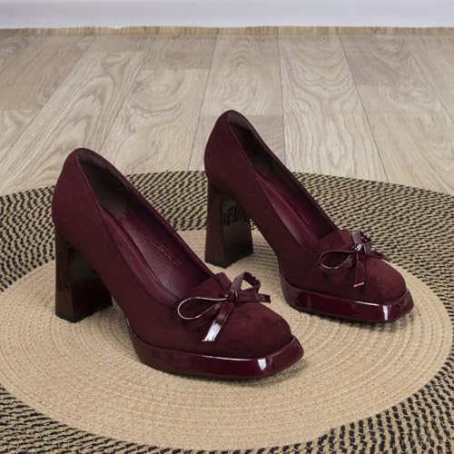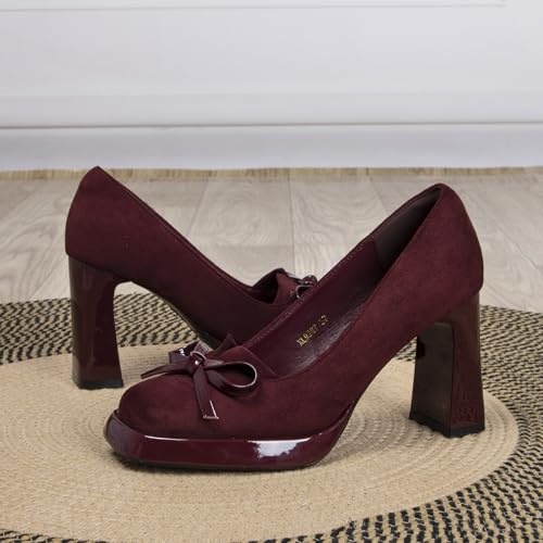 Sole material: RubberOuter material: Faux SuedeClosure type: Pull-OnDESIGN FEATURES: Classic suede platform pumps with decorative bow detail on square toe front, offering elegant style for formal and professional occasions. Available in versatile black, rich brown, and deep burgundy suede finishes to complement various outfits and occasions.HEEL STYLE: (approx) 3.54-inch (9cm) chunky block heel, 0.78-inch (2cm) platform. Chunky block heel design provides stable support and modern sophistication, perfect for all-day comfort and wear.CONSTRUCTION: Premium suede upper with glossy patent leather trim details, featuring a durable platform sole and secure fit.COMFORT ELEMENTS: Slip-on style with padded footbed and platform design helps distribute weight evenly for enhanced walking comfort.PACKAGE LIST: A pair of suede platform pumps, along with a cute shoe storage bag and a pair of soft heel pads. The cute storage bag is convenient for you to store shoes or other items when traveling; The soft heel pad provides a backup solution for any issues you may encounter while wearing shoes. Perfect for everyday use. High quality materials and excellent craftsmanship ensure long-lasting durability.
