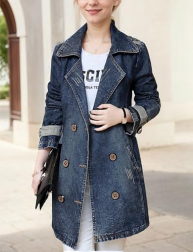 More information about Kwoki Women's Mid Long Denim Trench Coat Casual Slim Double Breasted Distressed Ripped Jean Jacket with Pockets
