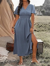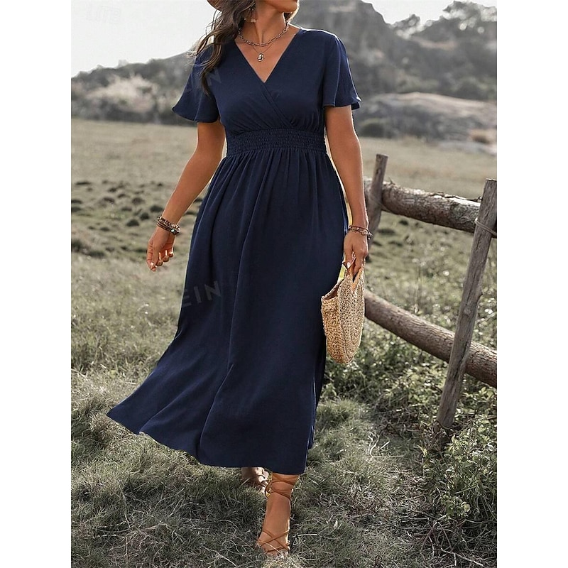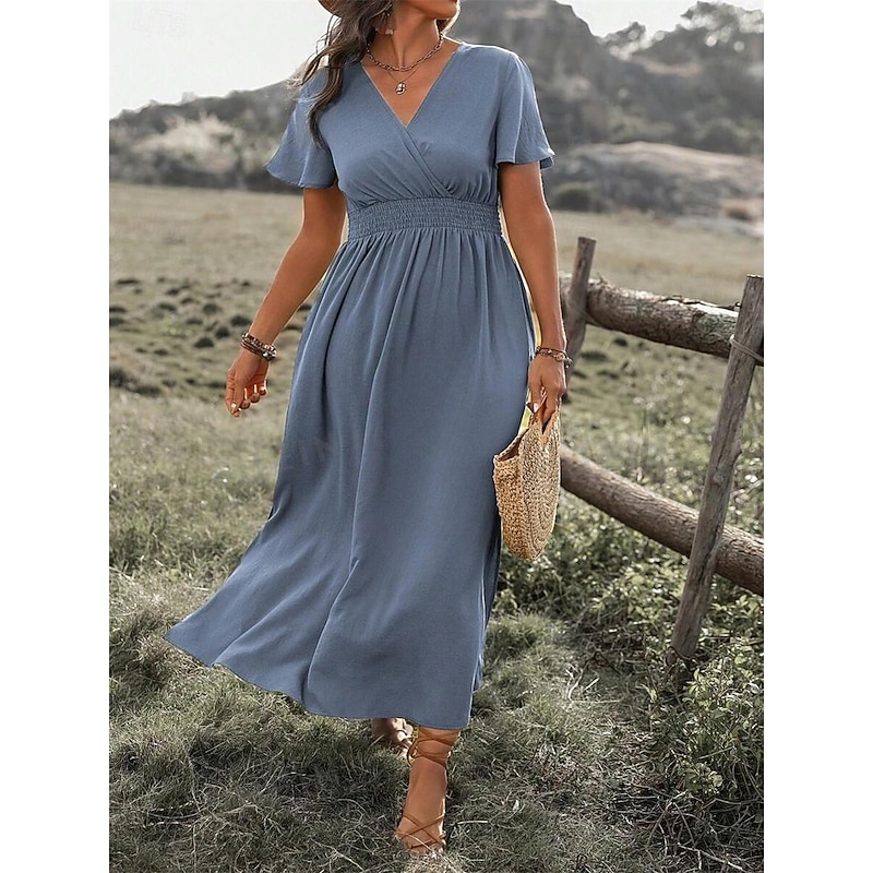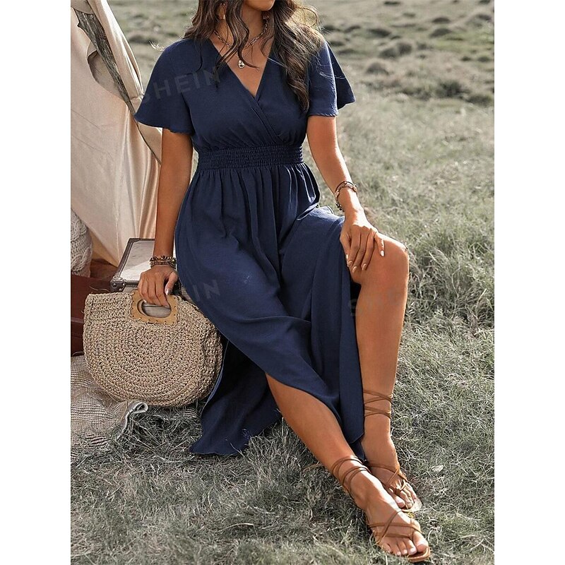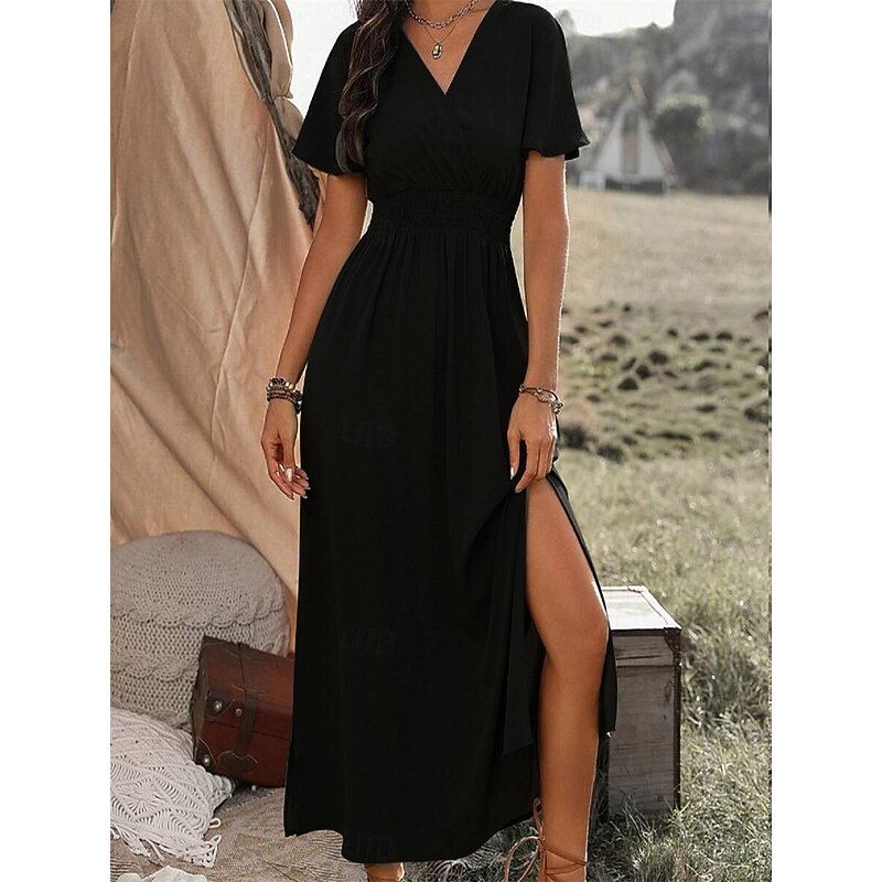Highlights [Fabric and Fit] : Crafted from lightweight polyester, this summer maxi dress ensures comfort with its soft, flowing fabric and micro-elasticity. The short sleeves and V-neckline bring a casual yet refined vibe, making it ideal for warm weather. The dress features a regular fit with a flattering silhouette accentuated by an elastic smocked waist, offering both style and ease of movement for all-day wear. [Design Highlights] : This elegant dress showcases a wrap-style V-neck and ruffle hem that adds a touch of romantic flair. The maxi length enhances its sophisticated appeal, while the subtle side slit provides movement and a hint of allure. [Occasions] : Perfect for dates, casual outings, or streetwear occasions. Whether you're heading out for a casual day or a more refined evening, this versatile dress combines elegance with effortless style. [Available Sizes] : The dress is available in a wide range of sizes from S to 5XL, catering to diverse body types and ensuring a comfortable fit for everyone. [Colors] : Choose from a selection of classic colors including Green, Black, Navy Blue, and Gray to suit your personal style and preference.