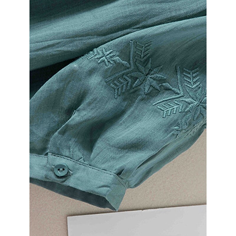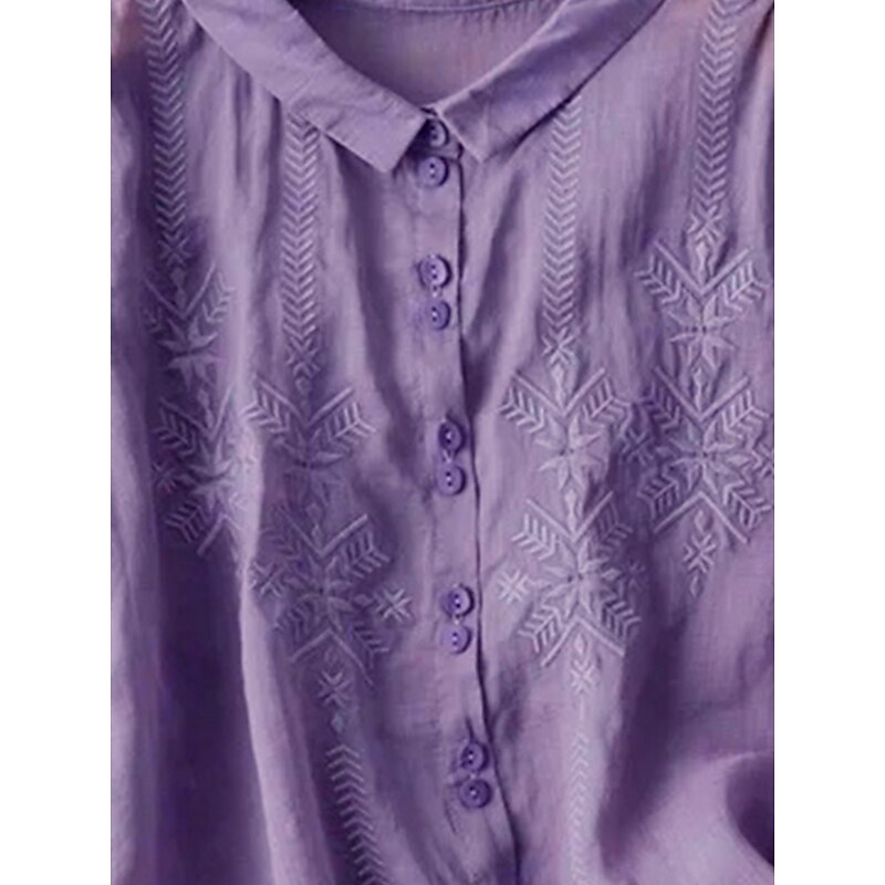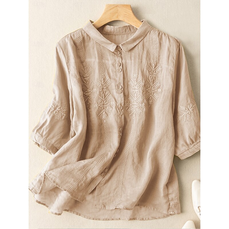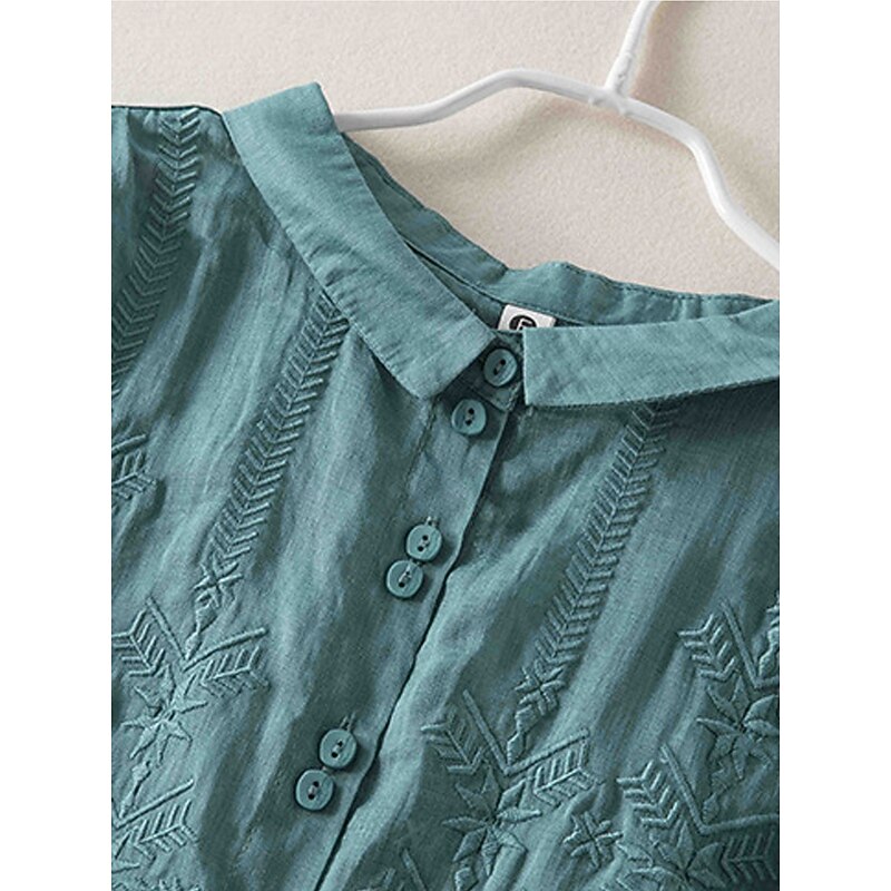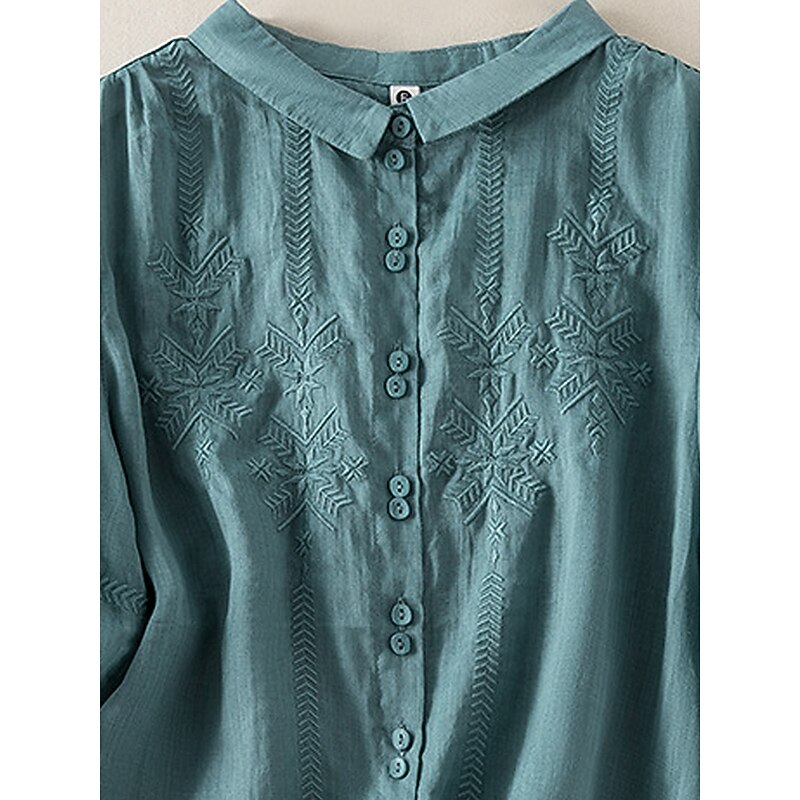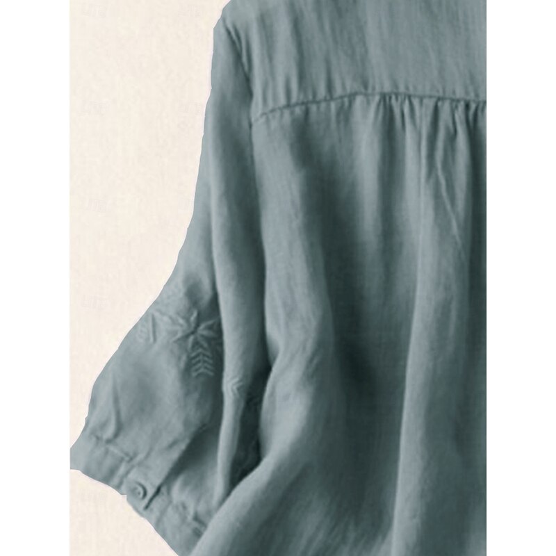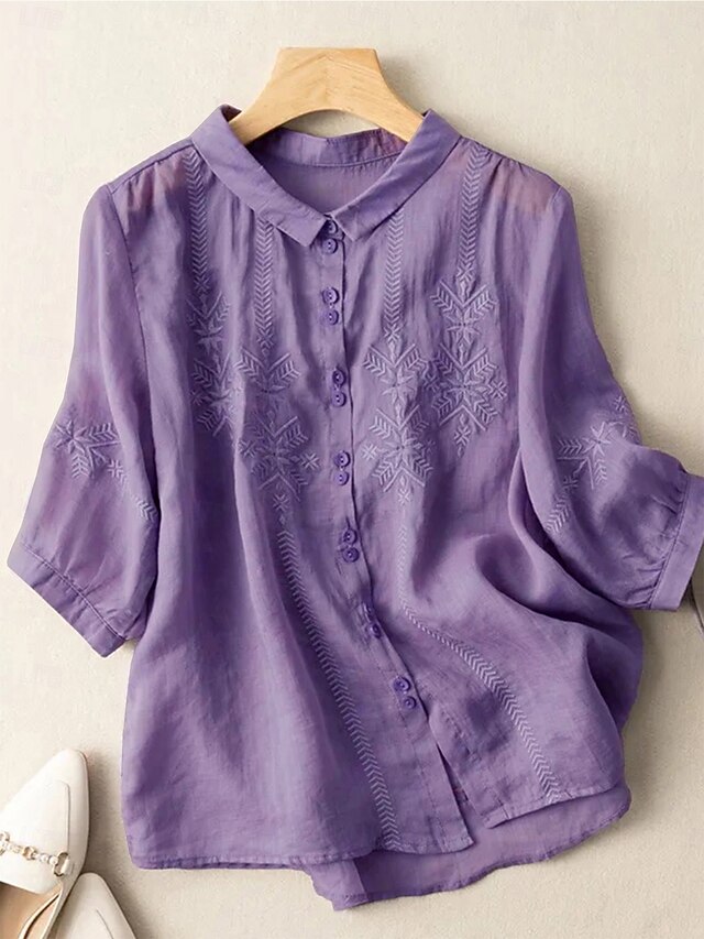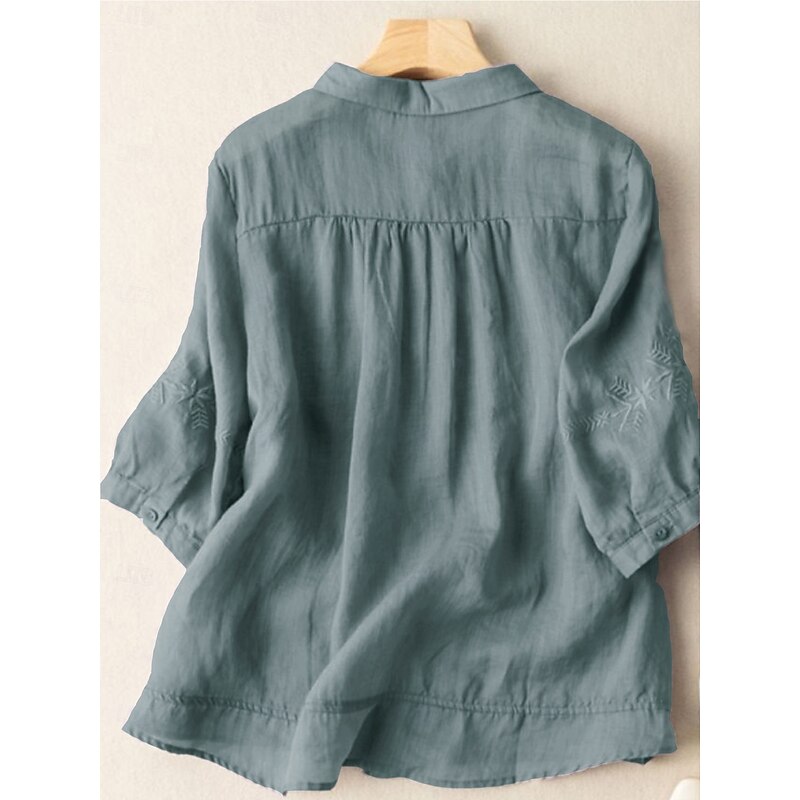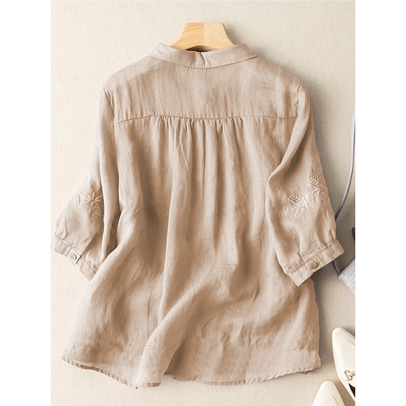 More information about Women's Shirt Linen-Inspired Shirts Button Up Solid Color Floral Casual Boho 3/4 Length Sleeve Elbow Sleeve Shirt Collar Regular Tops Daily Going out Embroidered Yellow Blue Purple Khaki Summer
